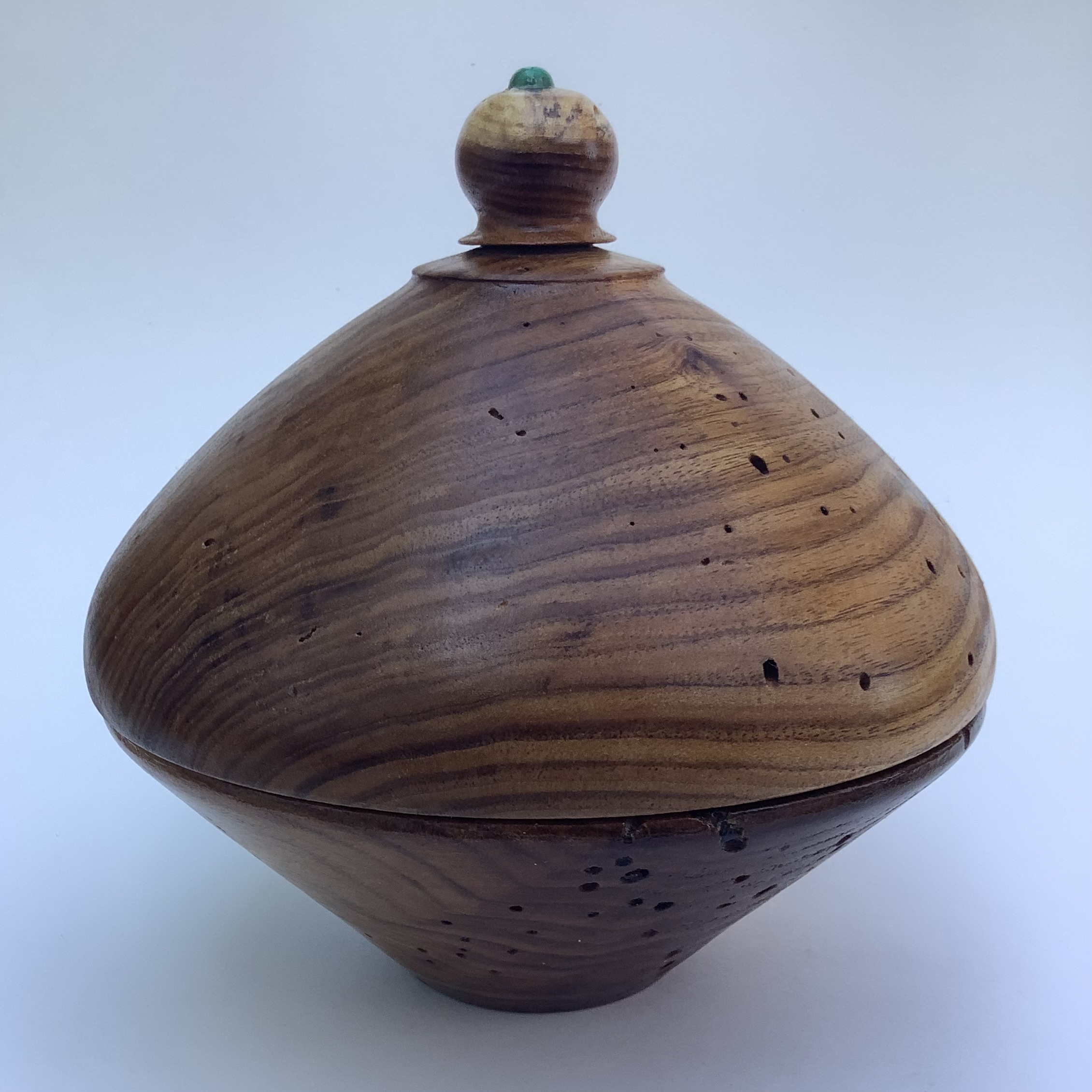 Butternut Lidded Vessel with Mulberry Finial and Malachite Embellishment